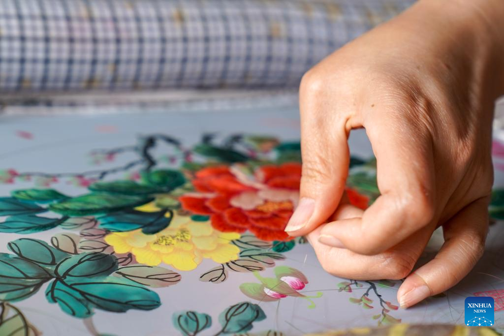 Chen Boyu draws patterns at the Jiali hair embroidery factory in Dongtai City, Yancheng of east China's Jiangsu Province, June 6, 2025. (Xinhua/Xue Yuge)