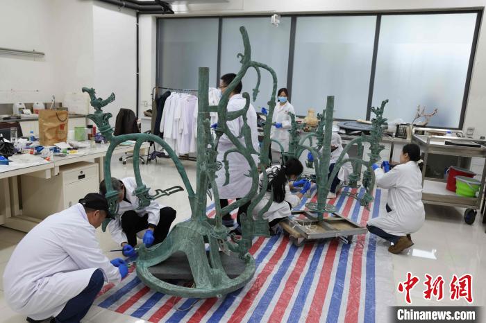 青銅神樹のレプリカ制作の様子(写真提供・三星堆博物館)。