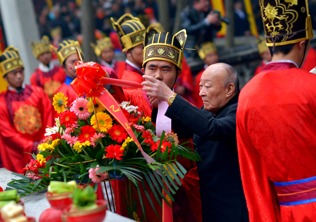 孔子后裔孔德墉向先祖孔子敬献花篮本