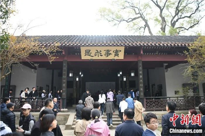 岳麓书院的讲堂外,悬有“实事求是”匾。图为3月30日,岳麓书院讲堂外人来人往。(资料图片)中新社记者 杨华峰 摄