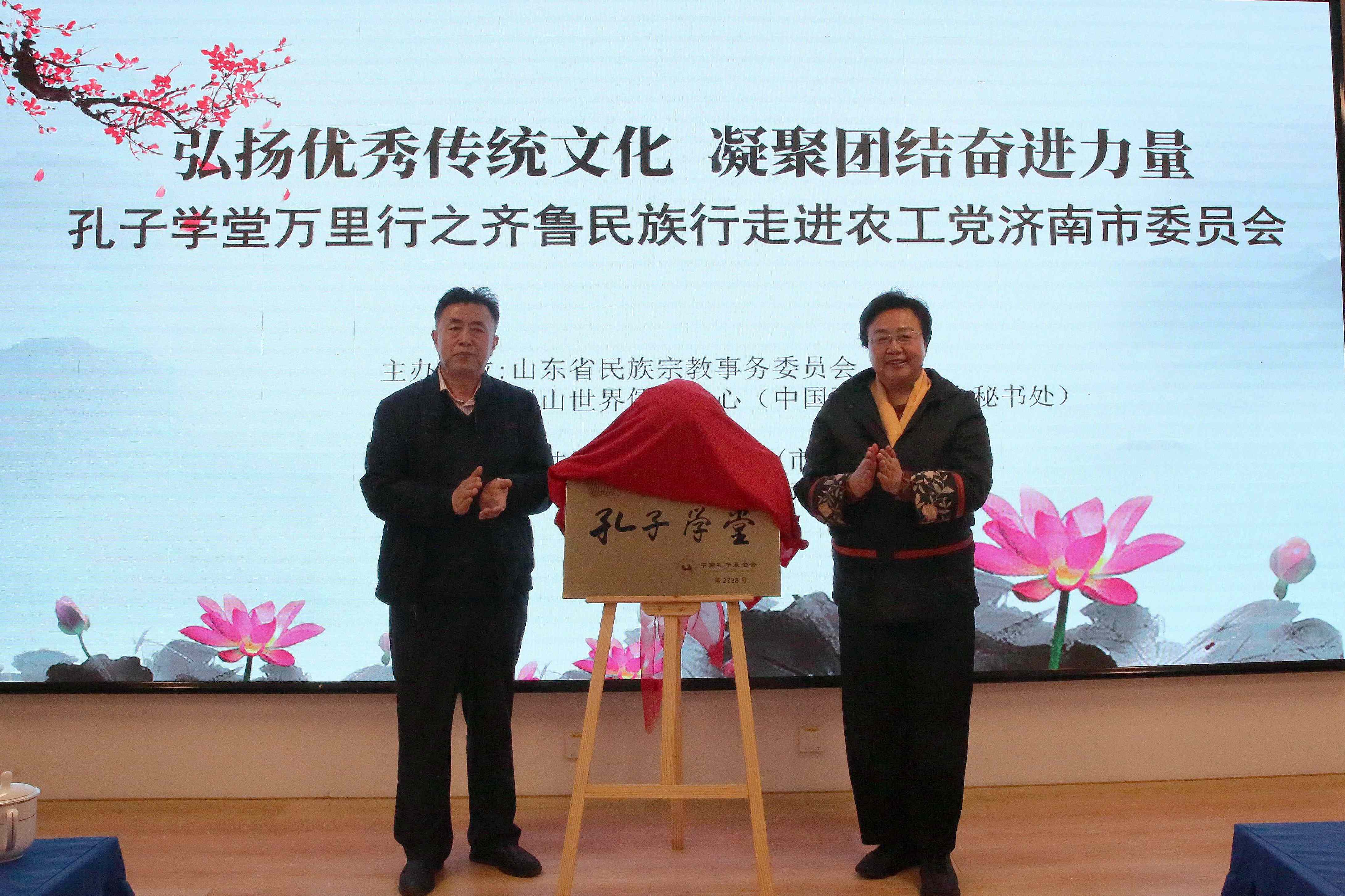 周静与省民族宗教委二级调研员韩昌钦为农工党济南市委会孔子学堂揭牌