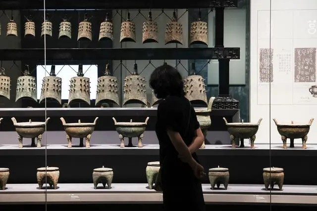 5月16日,观众在参观“海岱日新——山东历史文化展”展出的商周时期青铜器。 新华社记者 朱峥 摄