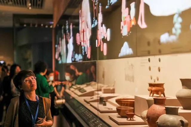 5月16日,观众在参观“海岱日新——山东历史文化展”展出的史前时期陶器。 新华社记者 朱峥 摄