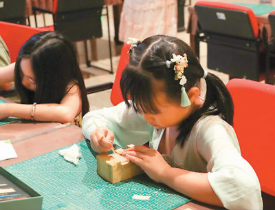 在四层的非遗手工艺体验中心,许多小朋友正在兴致勃勃地体验古法制玉、敦煌石粉彩绘技艺(壁画临摹)、纸笺加工技艺(流沙笺团扇制作)等非遗项目。一位小朋友正在美美地摆弄着自己亲手制作的流沙笺团扇。她的母亲许女士介绍说,这些项目虽然看着传统但其实非常时尚,孩子很喜欢这些手工项目,觉得很有趣;带孩子在博物馆里看展览还能做手工,是一项很有意义的体验。