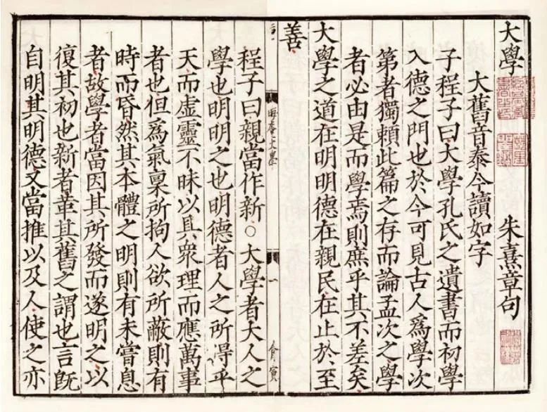 当我们从时代所提出的历史任务与儒家之传统立场及其一贯精神来理解《大学》之形成时,源自程颐而又成于朱子的今本《大学》的错谬也就非常明显了。其错误也就表现在其具体的解读中,至于程朱关于“《大学》乃孔氏遗书”的定位以及其关于《大学》“经一章,盖孔子之言,而曾子述之;其传十章,则曾子之意而门人记之”的划分,自然已经无需再辨。仅从程朱关于“在亲民”一句的理解与诠释,就可以清楚地看出其对于《大学》形成之社会历史背景的不解,以及其在此基础上所形成的某种改变或置换。比如,关于《大学》所谓“在明明德”与“在亲民”之说,朱子曾征引程颐的看法并注解说: