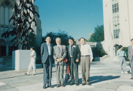 1995年夏在波士顿大学出席国际中国哲学会,郭齐勇(右一)与萧萐父先生、杜维明先生、陈来教授合影。