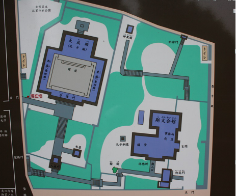 现在的圣堂比宽政11年扩建后的面积要小一些,占地13874平方米,但目前仍然是日本最大的孔庙。三进院落并不是一条直线,而是呈矩形(如下图所示)。从正门进入圣堂,左侧是仰高门,紧邻右侧的斯文会馆。