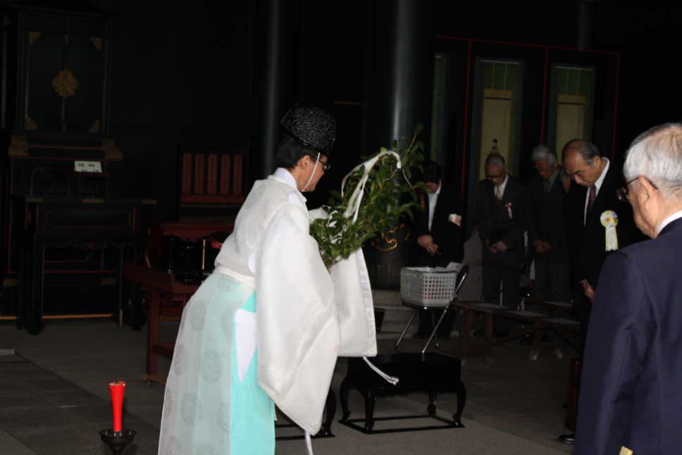 以上仪礼程序基本上是一套日本神道仪式色彩浓厚的释奠礼。首先是第4项修祓。这是日本神道祭祀开始时首先必须实施的一种净身仪式:神官手执“大麻”面对鞠躬低头的受礼者,以“左右左”的方向来回晃动,意味这样受礼者身心上的污秽与罪过就会被祓除转移到“大麻”上。此时,全体起立后,首先由年长且级别较高的神官向通常关闭的正面龛门行修祓礼,然后由年轻且级别较低的神官为主礼嘉宾、讲经讲师以及司会等主要参会代表依次行修祓礼。