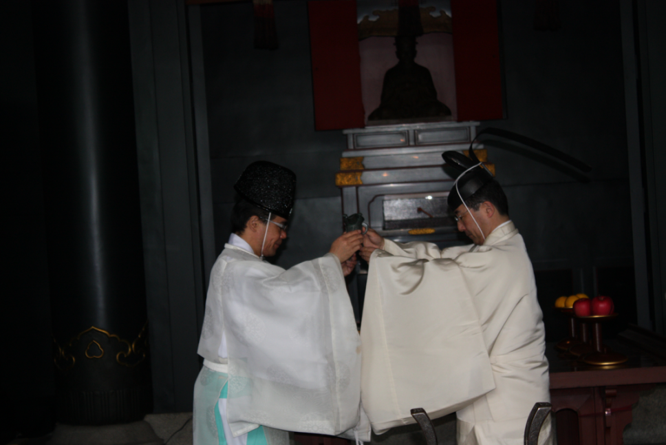 第5项开扉奏乐警跸即迎神礼:全体起立后,由坐在祭主德川恒孝先生右侧的、来自神田神社的三位伶人调笙吹笛,奏古典雅乐。同时年长且级别较高的神官虔诚地向正面龛门鞠躬敬礼后,一边有节奏地发出“哦!哦!哦!” 的三声警跸,一边恭敬地将两扇龛扉先右后左徐徐启开,而警跸之意即在告示所有参拜者:“至圣先师孔夫子大驾光临哦,请各位小心谨慎迎接” !龛扉里的孔子铜像不大,“高38厘米,宽13厘米,厚3厘米,头戴司寇冠,身着官服,青铜铸成,因日久天长,已呈黑色”(駱2009:85),是明代遗臣朱舜水从中国流亡日本时所带的3尊孔子像之一。