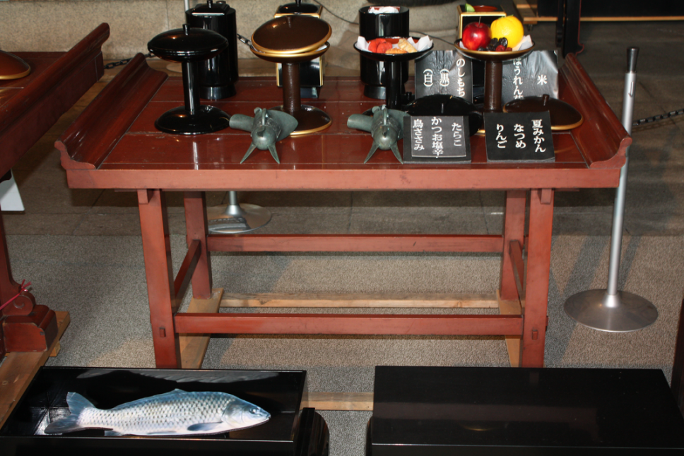 另外,释奠礼结束后,笔者观察到表中7条活鲤鱼改为7张照片代替。关于这一变化,后来宫田末子女士通过邮件很遗憾地告诉笔者,历次的释奠中一直供有失去知觉的活鲤鱼,但自2011年3月11日发生了东日本大地震后,举国上下因此谨慎从事,所以2011年与2012年度的释奠礼中没有供奉活鲤鱼而改用照片代替,以示哀痛。