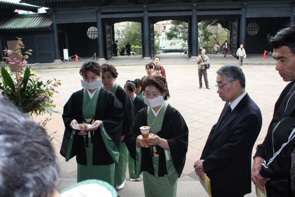 唱歌仪式则与献茶式类似,属于近代日本发明创造,但历史比献茶式更悠久。发给所有参会者的歌词资料中注明:这首歌是在昭和2年(1927年)6月向市民公开募集的673首歌词中严选的,作者是下平末藏先生,由当时的东京音乐学校(现在的东京艺术大学音乐系)中田章先生作曲,一直沿用至今。