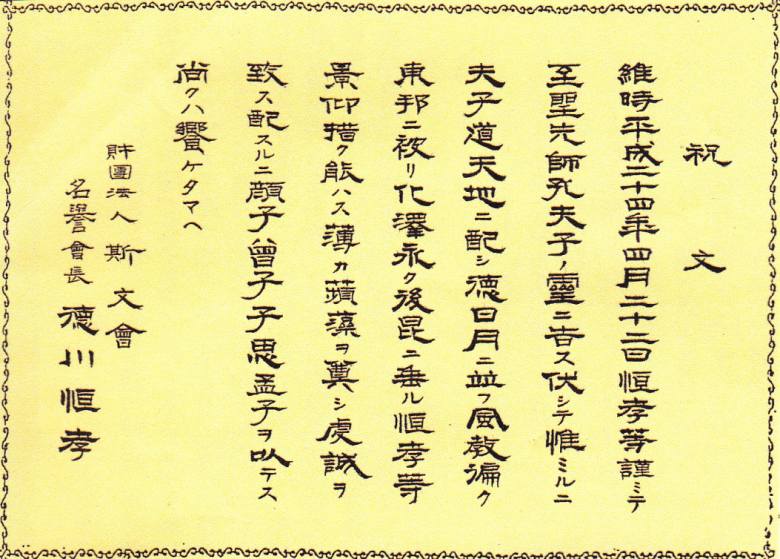第9项德川恒孝名誉会长祭文奉读仪式看起来似乎与现在中国曲阜祭孔大典中的相似,而实际上有些差异。祭文按照神道仪式称为“祝文”,系古体日文,简明扼要,扣人心弦。其体裁与内容通常固定不变,每年只需更改年月日即可,因为祭主很少变换。比如德川恒孝先生是德川宗家第18代“当主”掌门人,从平成元年(1989年)5月1日就任斯文会名誉会长后一直担任祭主至今。2012年的祝文原版如图所示。