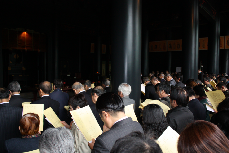 整个释奠礼大约持续了近一小时,虽规模不大,也没有警察在场,但井然有序,气氛素雅,令人肃然起敬。据斯文会会计主任宫田末子女士介绍,这次参加释奠总人数320名左右,其中来宾与斯文会会员以及二松学舍大学附属高中学生近120名,其余200余名为自由参加的普通市民及观光游客。笔者在人群中十分高兴地见到了来自史迹足利学校的前桥勋先生,他带领着另外两名男同事代表史迹足利学校来参加。