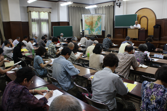 2012年7月7日,笔者到汤岛圣堂讲堂参观了正在举行的市民《论语》素读讲座。讲堂基本满座,学员以中高龄男女居多,这与日本近年高龄少子化有关。年长的讲师在台上领着很多基本上不会汉语的学员进行日式“素读”。