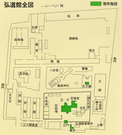弘道馆当时占地54000坪(17.8公顷),规模相当于屈指可数的加贺藩明伦堂(约17800坪)与长州藩明伦馆(14000坪)的3-4倍,成为各藩中最大藩校,还比幕府昌平阪学问所大近5倍。