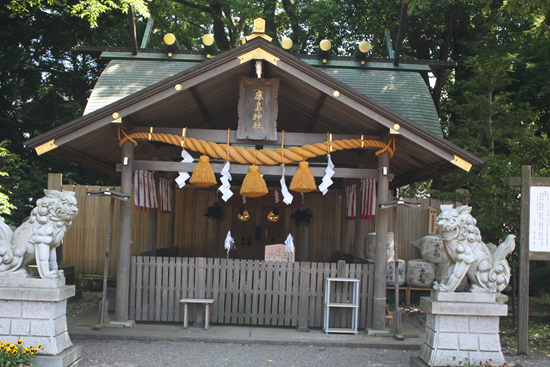 大成殿为木制建筑,单檐歇山式屋顶“入母屋造”,屋顶并非铜圆瓦,而是“屋根瓦葺”的古圆瓦。据畑野介绍,此殿面阔三间8.01米,进深三间4.81米,高7.73米,殿内面积为38.53平方米,殿内外“屋根面积”(占地面积)为153.10平方米(畑野2011:146)。与汤岛圣堂大成殿相比,此庙的殿内面积仅相当于它的约13.6%。孔祥林等认为此处孔子庙规模小的主要原因是孔子思想在德川齐昭的眼中地位已经降低,实际上孔子地位在日本的下降从19世纪就已经逐步开始了(孔·孔2011:903)。对此观点,笔者并不完全同意。因为一般来说,我们不能根据建筑物的规模大小来判断建造者对其重视程度以及建筑物所体现的象徵意義與社会价值。实际上,此处孔子庙近旁的鹿岛神社规模更小(参见图片7),而日本学术界通常认为藩主齐昭略偏重神道。另外,除了国家级规格的汤岛圣堂外,日本各地孔子庙通常规模也都很小。