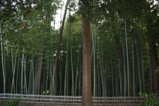 笔者在考察偕乐园时注意到东门附近由南到北依次有“御成门”与“好文亭表门”(正门,参见图片11),故依次从御成门与好文亭表门进入偕乐园,竟发现每道门附近的设计都不一样。其中好文亭表门令人印象深刻,位于园内西北面,被涂上黑漆,所以通常被称为“黑门”。从此门入园,地势由高渐低,经过一名为“一木户”而屋顶为草葺的独门后,看到一大片郁葱茂密的孟宗竹(参见图片12)与杉树林,而沿着这一段让人感到清凉阴暗的竹杉林道向东南行走,地势由低渐高,经过几扇门到达好文亭(参见图片13)附近高台时仿佛“柳暗花明又一村”:周围是视界开阔明朗的梅林。而由此高台眺望到美丽清澈的千波湖,令人心旷神怡。