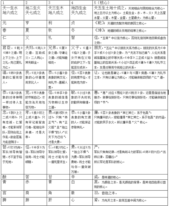 表1是河图象数、《易经》《乾》《坤》之道、儒家“五常”、“五伦”、中医“五行”、“五脏”、“五味”、兵家的“五法”、音乐的“五音”、美术的“五色”等对应关系: