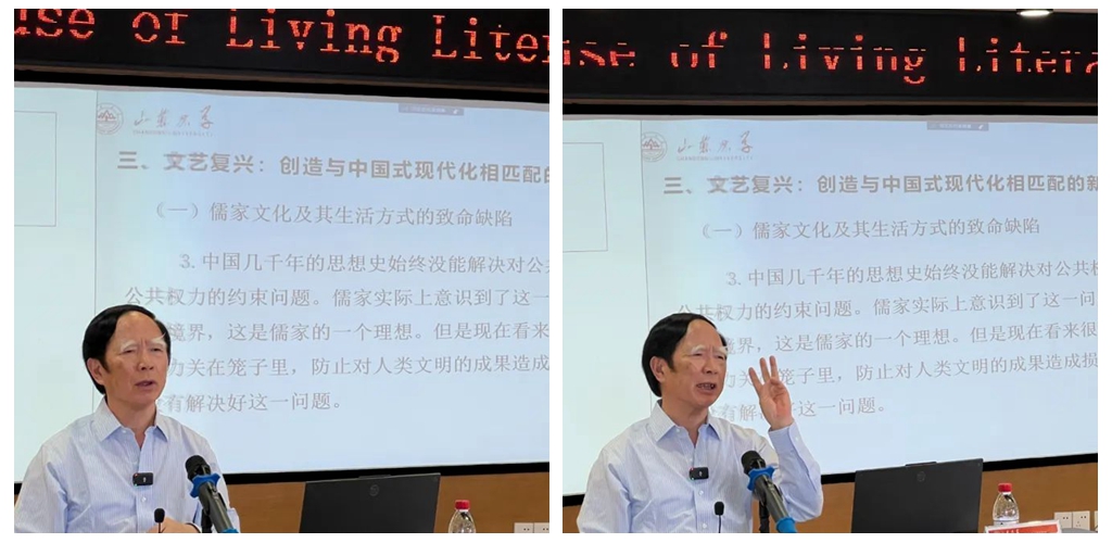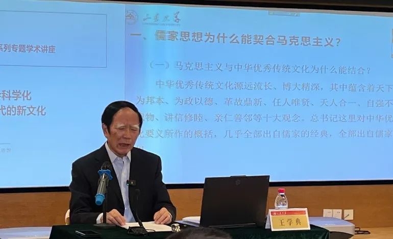 10月27日晚,中华优秀传统文化“两创”系列专题学术讲座第四讲在山东大学中心校区文学生活馆举行。十三届、十四届全国政协常委,山东大学讲席教授,儒学高等研究院执行院长,《文史哲》主编,《孔子研究》主编王学典作题为“儒家思想的社会科学化与创造我们这个时代的新文化”的学术报告。人文社科研究院院长郑敬斌主持报告会。