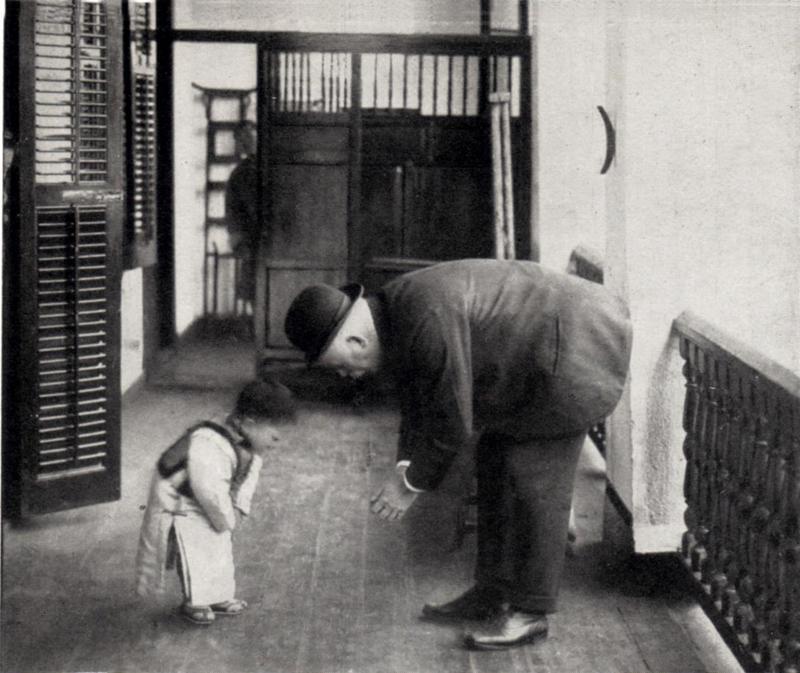 杭州广济医院院长梅藤更在巡视病房时跟一位三岁小病人互致问候(沈弘教授提供)