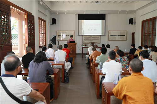 近日,厦门大学国学研究院副院长、朱熹第27代裔孙朱人求教授应邀在厦门鸿山书院讲堂作《朱子文化的当代传承》主题讲座。朱人求教授从全球化和国学热的时代背景、朱子文化的核心价值理念、朱子文化的实践等方面阐述了朱子文化在当代传承的意义和需要落实的问题。厦门市佛教协会驻会副会长、鸿山寺住持、鸿山慈善会会长法云法师,厦门古代艺术品研究会会长郭明尧,福建鸿源汉家书院院长张志宏等社会各界人士出席了讲座现场。
