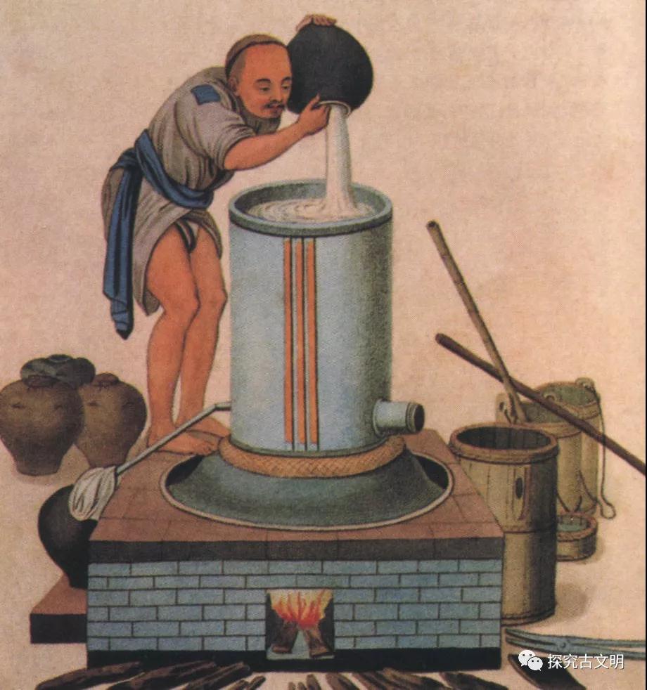 图6【清】酿酒蒸馏器。这是酿造烧酒的清代蒸馏器,图中描绘出清代蒸馏器的式样,蒸酒者正在向天锅内倒入冷却水。