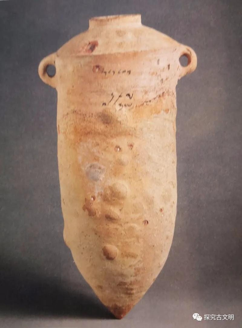 腓尼基双耳尖底瓶(公元前700-前600年),塞浦路海岸沉船打捞出水,瓶身铭刻着拥有人和葡萄酒检查员的名字。地中海周边常见这种尖底瓶。
