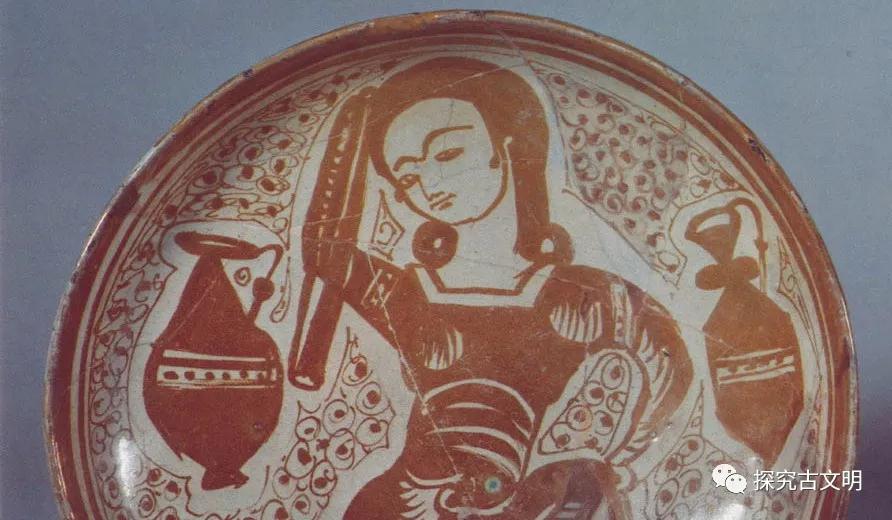 中东陶钵画(12 世纪初),描绘法蒂玛王朝使用的酒具,钵画上左为大食胡瓶,右为带盖小口尖底瓶。这是古代中东和北非最珍奇的尖底瓶。美国华盛顿弗利尔美术馆藏。