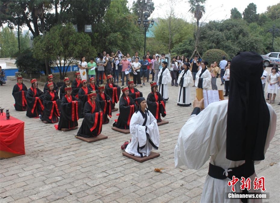 2016年9月28日,武汉大学国学班学生身穿汉代朱子深衣,行“释菜礼”。