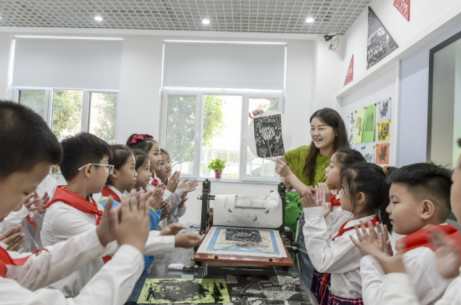 师生共同制作版画《荷之韵》