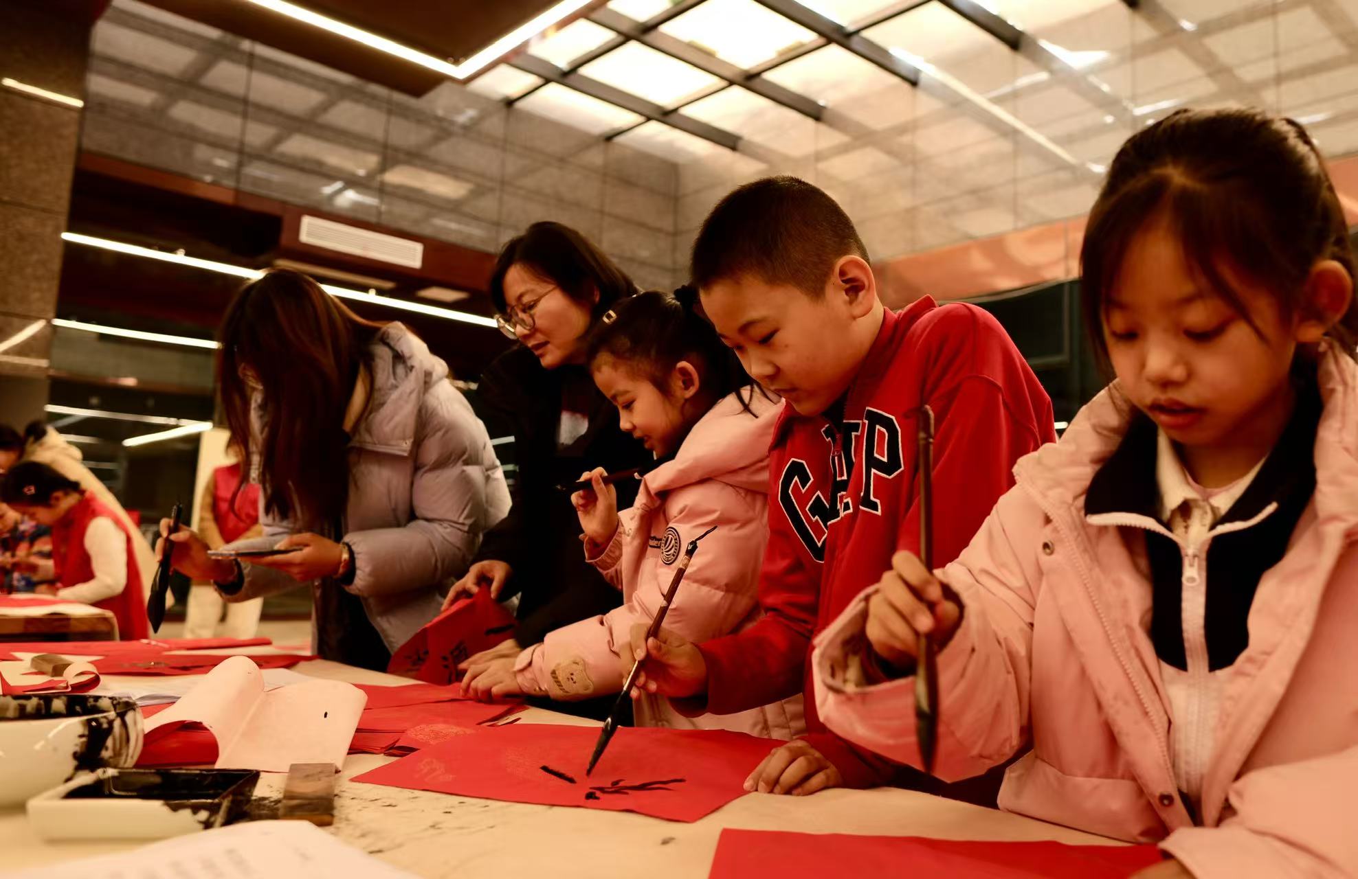 孩子们写春联。(侯新建 摄)
