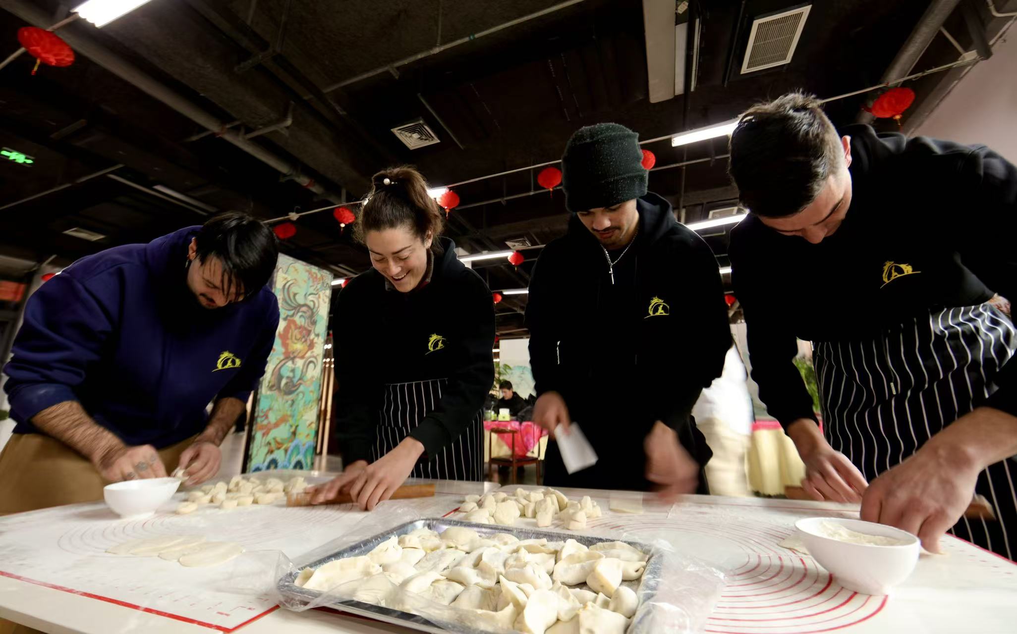 外国游客现场学包饺子。(侯新建 摄)