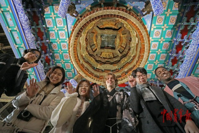 11月25日,在位于北京先农坛的北京古代建筑博物馆,中外学子在一处藻井下方合影留念。当日,来自中国、美国、俄罗斯、巴基斯坦、韩国等国家的45名清华学子,来到北京中轴线15处遗产构成要素之一的先农坛,以拜殿、太岁殿等古建筑为研学载体,通过参访讲解及分组实践,学习中国古建形制规范、榫卯结构技艺、传统建筑色彩美学及古建筑数字保护技术等。陈剑/摄