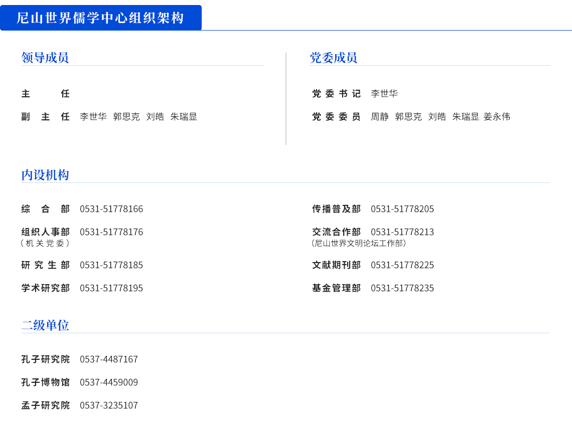 尼山世界儒学中心(中国孔子基金会秘书处)下设综合部、组织人事部(机关党委)、研究生部、学术研究部、传播普及部、交流合作部(尼山世界文明论坛工作部)、文献期刊部、基金管理部。