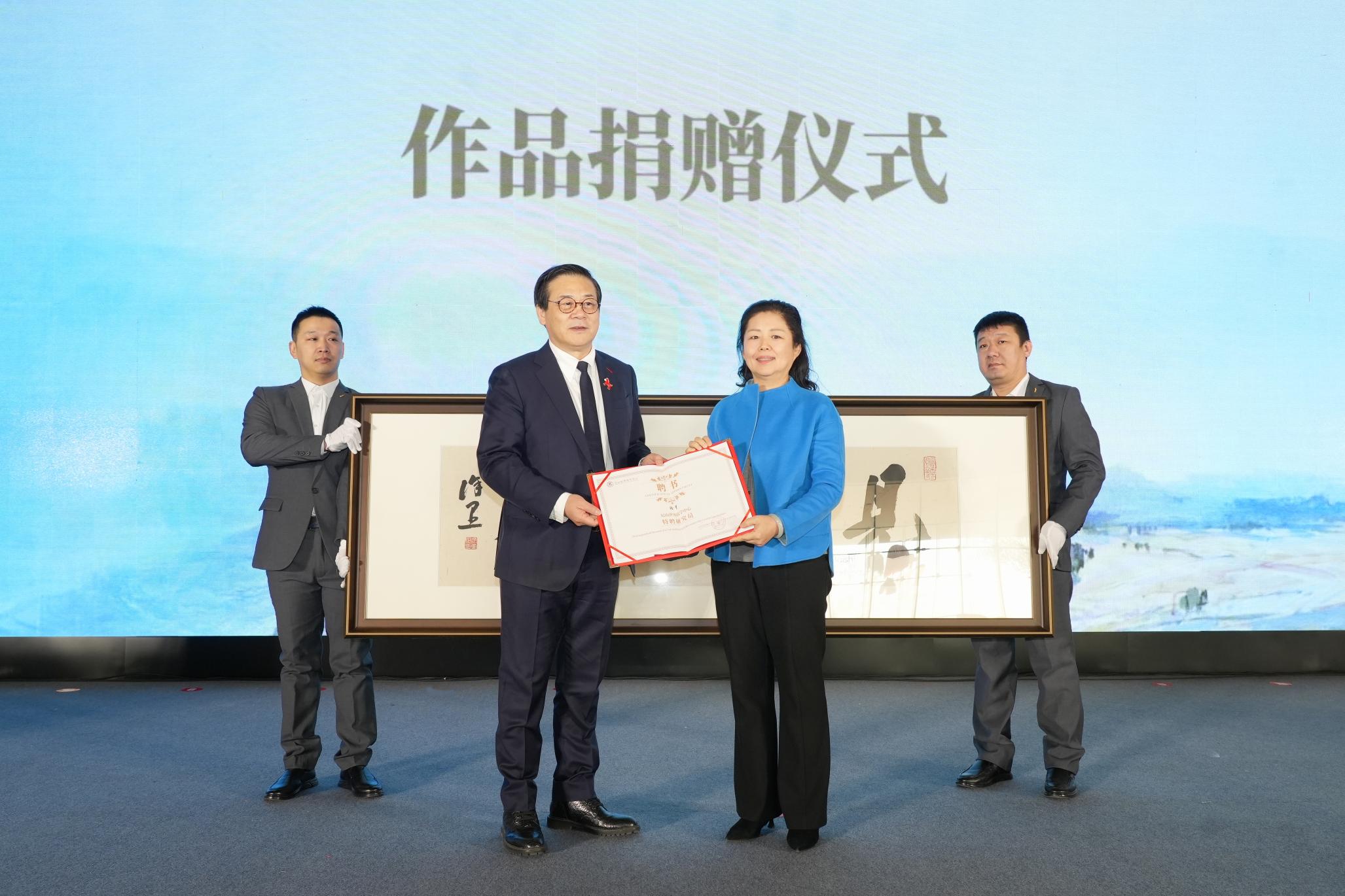 开幕式上,徐里向尼山世界儒学中心捐赠书法作品,国承彦为徐里颁发尼山世界儒学中心特聘研究员聘书。