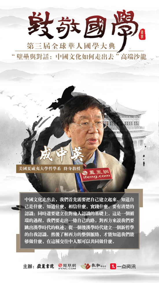 编者按:8月16日下午,世界哲学大会期间首个外场沙龙“壁垒与对话:中国文化如何走出去”在京举行,成中英、洪汉鼎、阿克曼、沈清松、倪培民、葛承雍、朱汉民、干春松等知名中外专家学者齐聚,在跨文明对话的语境下,探讨中国文化如何打破壁垒实现真正走出去。著名哲学家、美国夏威夷大学哲学系终身教授成中英先生在发言中回顾了自己几十年来在海外教学,建立、传播中国哲学话语体系的历程。他认为中国文化走出去,首先需要把自己建立起来,知道自己是什么。我们要走出一条自己的路,跳出汉学时代的轨迹,从一个后汉学时代建立一个新哲学的自我认识。本文系凤凰网记者根据成中英教授发言整理而成。