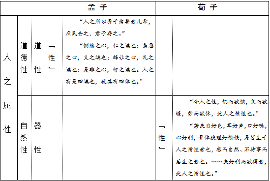 从图表中我们可以很直观地看到,两人关于“性”的陈述其实是对人性整体性之不同层面的把握,孟子之“性”所指涉的是人的属性结构中的道德性层面,是人之所以为人者,属于形而上之“道”;而荀子之“性”所指涉的则是人的属性结构中的自然性层面,它不是人之所以为人者,属于形而下的“器”。二者虽然使用了同一个概念——“性”,但内容上却并无交集,没有冲突,即便把他们的表述和结论移放在同一个人的名下,之间依然不会形成矛盾和对立,因为两者原本就没有对立,也不应该有对立。这是其一。