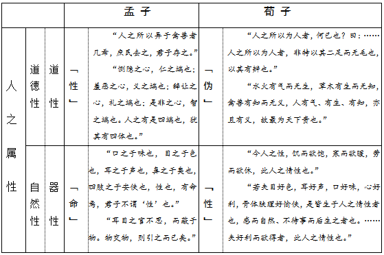 梳理至此,关于孟、荀人性论的对照图表已经可以以一个完整、清晰的面目呈现在我们面前了。请看: