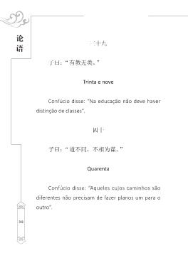 论 语 三十九 子曰:“有教无类。” Trinta e nove Confúcio disse: “Na educa??o n?o deve haver distin??o de classes”. 四十 子曰:“道不同,不相为谋。” Quarenta Confúcio disse: “Aqueles cujos caminhos s?o diferentes n?o precisam de fazer planos um para o outro”. 302