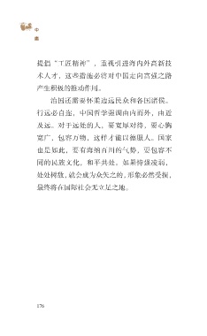 ?中 庸 提倡“工匠精神”,重视引进海内外高新技 术人才,这些措施必将对中国走向富强之路 产生积极的推动作用。 治国还需要怀柔边远民众和各国诸侯。 行远必自迩,中国哲学强调由内而外,由近 及远。对于远处的人,要宽厚对待,要心胸 宽广,包容万物,这样才能以德服人。国家 也是如此,要有海纳百川的气势,要包容不 同的民族文化,和平共处。如果恃强凌弱, 处处树敌,就会成为众矢之的,形象必然受损, 最终将在国际社会无立足之地。 176