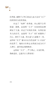 ?中 庸 的考验,就算千百年后的圣人也不会对“天子” 的所作所为有所质疑。 经过了“鬼神”的考验,内心便不会再 疑惑、畏惧,这说明“天子”对国家的治理 顺应了天道;经过了时间的考验,得到后世 圣人的认可,这说明“天子”的仁政赢得了 民心,顺应了人道。将天道与人道集于一身, 这样的“天子”就可以认为是达到“止于至善” 的境界了,他的言行举止自然就会成为天下 人奉行、遵守的法则和秩序。 这样的“天子”,严于律己,以身作则, 勤政爱民,怎能不让人赞美呢? 252