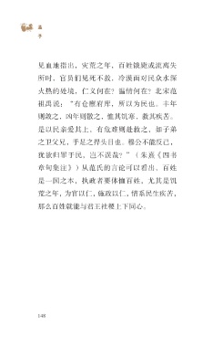 ?孟 子 见血地指出,灾荒之年,百姓饿毙或流离失 所时,官员们见死不救,冷漠面对民众水深 火热的处境,仁义何在?温情何在?北宋范 祖禹说:“有仓廪府库,所以为民也。丰年 则敛之,凶年则散之,恤其饥寒,救其疾苦。 是以民亲爱其上,有危难则赴救之,如子弟 之卫父兄,手足之捍头目也。穆公不能反己, 犹欲归罪于民,岂不误哉?”(朱熹《四书 章句集注》)从范氏的言论可以看出,百姓 是一国之本,执政者要体恤百姓,尤其是饥 荒之年,为官以仁,施政以仁,情系民生疾苦, 那么百姓就能与君王社稷上下同心。 148