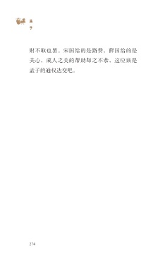 ?孟 子 财不取也罢。宋国给的是路费,薛国给的是 关心,成人之美的帮助却之不恭,这应该是 孟子的通权达变吧。 274