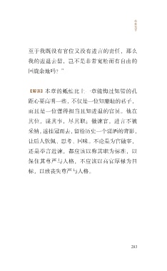 公 孙 丑 下 至于我既没有官位又没有进言的责任,那么 我的进退去留,岂不是非常宽松而有自由的 回旋余地吗?” 【解读】本章的蚳蛙比上一章能悔过知错的孔 距心要高明一些,不仅是一位知廉耻的君子, 而且是一位懂得担当且知进退的官员。他在 其位,谋其事,尽其职;做谏官,进言不被 采纳,遂挂冠而去,留给历史一个潇洒的背影, 让后人钦佩、思考、回味。不论是为官做宰, 还是举言进谏,都应该以称其职为标准,以 保住其尊严与人格,不应该以高官厚禄为目 标,以致丧失尊严与人格。 283