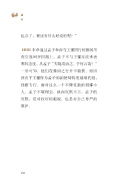 ?孟 子 包办了,我还有什么好说的呢?” 【解读】本章通过孟子奉命与王 同行到滕国吊 丧后返回齐国路上,孟子不与王 交流来表 明其态度。从孟子“夫既或治之,予何言哉?” 一语可知,他们在滕国之行并不愉快,原因 就在于王 作为孟子的副使却恃宠越俎代庖, 独断专行。面对这么一个不懂礼数的粗鄙小 人,孟子不屑理会,故而沉默不言。孟子的 沉默,是对权奸的藐视,也是对自己尊严的 维护。 286