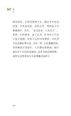?孟 子 掩饰错误,让错误延续下去,阻止齐王改过 迁善,实在是误国、误君之举,受到孟子含 蓄地批评。其实,“金无足赤,人无完人”, 犯错,在所难免。孟子认为,作为君子不在 于犯不犯错,而在于怎样对待错误。古代君 子的过错好像日食、月食一样,人民都能看到, 等到他改正错误后,人民都会敬仰他;而后 来的君子不仅将错就错,还要为错误做辩解, 这种文过饰非的行为就像掩耳盗铃了。 304