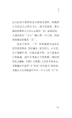 告 子 上 定人的求生欲望有着天然的合理性,但既然 上天注定人之所以为人,而不是禽兽,那么 就应该秉承人之本心去面对一切。也就是说, 人就应该以“人心”做人事、行人道,如此 所表现出的就是“义”。 在孟子看来,“义”的价值意义远比生 存要高贵得多,苟且偷生,枉为其人。不义者, 为了能够生存,可能无恶不作;为了避免死 亡的祸患,就不会考虑人生的价值。他们没 有礼义廉耻,不讲仁义道德。人只有守住本心, 才能做出不违背“义”甚至“舍生取义”的举动, 才能在人生的旅途中写出一个大大的“人”字。 213