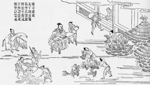 노 소공 10년(기원전 532년)에 공자는 20세로 계손씨(季孙氏)의 위리(委吏), 즉 창고 출입 장부를 관리하는 소관을 지냈다. 공자는 일을 열심히 해서 계량, 계산, 부기가 모두 정확하다.