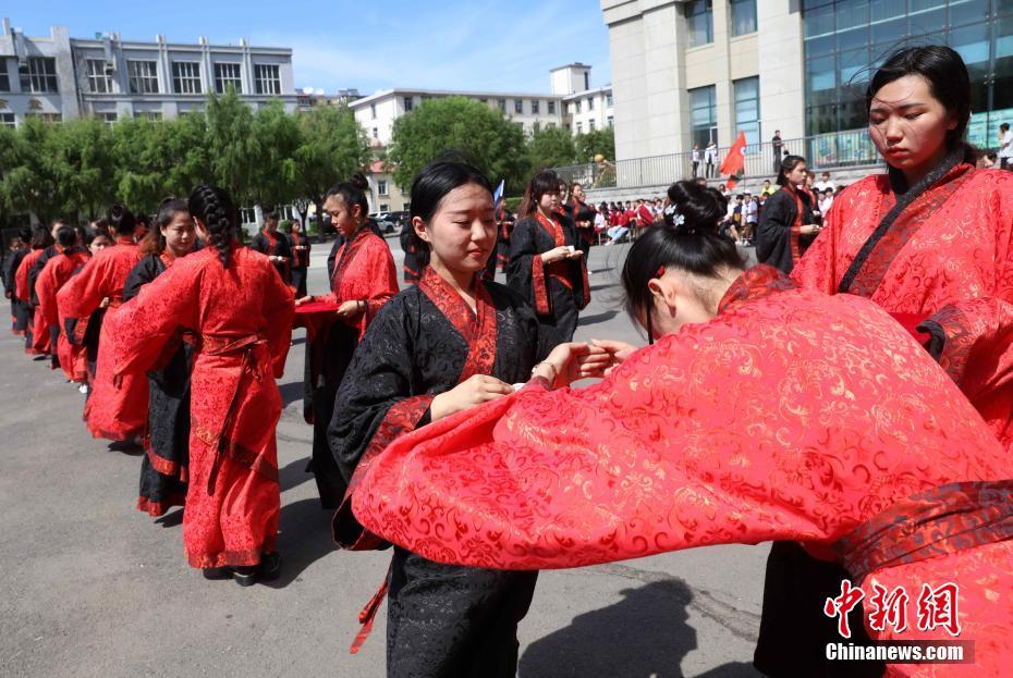 6月13日下午,哈尔滨市第四届暨丁酉年汉服集体成人礼在黑龙江旅游职业技术学院举行。该校82名大一学生代表身穿传统汉服,进行了洗礼、加冠加笄礼(儒冠或钗冠)、醴礼(冠者笄者行拜礼)、取字礼、宣誓礼等环节,以中国传统的庄严仪式迎接18岁“成人礼”。图为现场女同学接过醴酒进行醴礼。