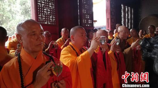 图为少林寺方丈释永信(左二)等五位法师在“无遮大会”开幕式祈福法会上洒净